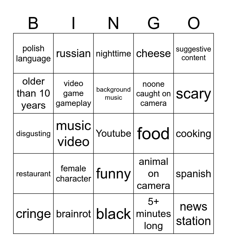This bingo card has a free space and 24 words: female character, brainrot, background music, cringe, suggestive content, polish language, older than 10 years, russian, food, funny, noone caught on camera, disgusting, animal on camera, spanish, video game gameplay, 5+ minutes long, cooking, nighttime, scary, music video, news station, restaurant, cheese and black.
