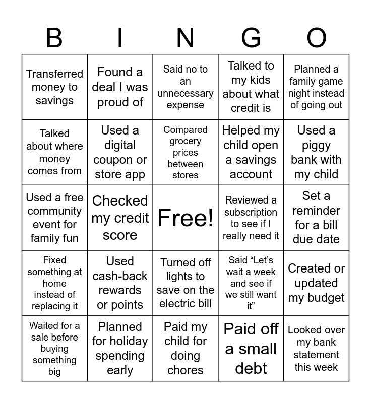 This bingo card has a free space and 39 words: Cooked dinner at home instead of ordering out, Used leftovers for lunch, Shopped at a thrift or resale store, Used a digital coupon or store app, Waited for a sale before buying something big, Turned off lights to save on the electric bill, Compared grocery prices between stores, Reused or repurposed something instead of buying new, Planned a family game night instead of going out, Fixed something at home instead of replacing it, Checked my credit score, Talked to my kids about what credit is, Looked over my bank statement this week, Set a reminder for a bill due date, Reviewed a subscription to see if I really need it, Used cash-back rewards or points, Put money in an emergency fund, Transferred money to savings, Created a wish list before shopping online, Said “Let’s wait a week and see if we still want it”, Talked about where money comes from, Paid my child for doing chores, Helped my child open a savings account, Used a piggy bank with my child, Talked about giving or donating to others, Let my child help with grocery shopping or budgeting Encouraged my child to save for something special, Talked about how to use a debit card safely, Played a money-related game with my family, Shared a money lesson from my own experience, Found a deal I was proud of, Stuck to my grocery list, Had a “no spend” day or weekend, Said no to an unnecessary expense, Planned for holiday spending early, Paid off a small debt, Saved a few dollars without even trying, Created or updated my budget, Used a free community event for family fun and Talked to my partner about financial goals.