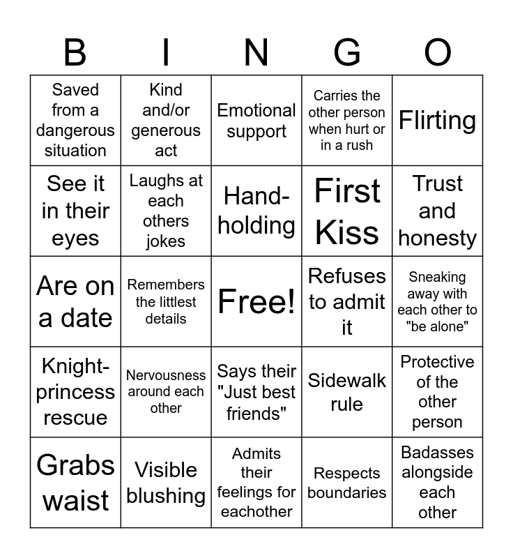 This bingo card has a free space and 24 words: Nervousness around each other, Visible blushing, Hand-holding, Grabs waist, Flirting, Saved from a dangerous situation, See it in their eyes, Kind and/or generous act, Refuses to admit it, Says their "Just best friends", First Kiss, Are on a date, Sidewalk rule, Protective of the other person, Laughs at each others jokes, Respects boundaries, Sneaking away with each other to "be alone", Emotional support, Trust and honesty, Remembers the littlest details, Badasses alongside each other, Knight-princess rescue, Carries the other person when hurt or in a rush and Admits their feelings for eachother.
