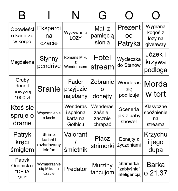 This bingo card has 36 words: Płacz strimerki, Valorant / śmietnik, Murziny tańcujom, Magdalena, Ktoś się spruje o drame, Żebranie o donejty, Słynny pendrive, Predator, Prezent od Patryka, Donejty z życzeniami, Józek i krzywa podłoga, Mati z pamięcią słonia, Krzychu i jego dupa, Sranie, Fotel stream, Opowieści o karierze w korpo, Patryk kręci śmigłem, Wenderas się podlizuje, Gruby donejt powyżej 1000 zł, Wyzywanie LOŻY, Fader przyjdzie najebany, Wspomnienie o kocie, Wenderas zaśnie i zacznie chrapać, Wenderas i spalona karta na Gothicu, Sceneria jak z baby shower, Eksperci na czacie, Wycieczka do Stanów, Wymądrzanie się Miku na czacie, Romans Miku z Wenderasem, Wygrana kogoś z loży na giveaway, Barka o 21:37, Patryk Onanista i "DEJA VU", Klasyczne spóźnienie na streama, Morda w tort, Strim z kuchni i rozładowany telefon and Strimerka "zabłyśnie" inteligencją.