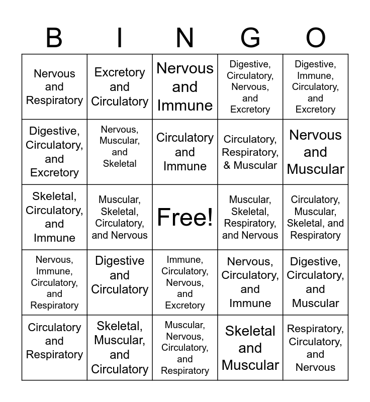 This bingo card has a free space and 25 words: Circulatory and Respiratory, Digestive and Circulatory, Circulatory and Immune, Skeletal and Muscular, Nervous and Muscular, Nervous and Respiratory, Excretory and Circulatory, Nervous and Immune, Circulatory, Respiratory, & Muscular, Digestive, Circulatory, and Muscular, Skeletal, Circulatory, and Immune, Nervous, Muscular, and Skeletal, Nervous, Circulatory, and Immune, Respiratory, Circulatory, and Nervous, Digestive, Circulatory, and Excretory, Skeletal, Muscular, and Circulatory, Muscular, Nervous, Circulatory, and Respiratory, Digestive, Circulatory, Nervous, and Excretory, Circulatory, Muscular, Skeletal, and Respiratory, Nervous, Immune, Circulatory, and Respiratory, Muscular, Skeletal, Circulatory, and Nervous, Immune, Circulatory, Nervous, and Excretory, Muscular, Skeletal, Respiratory, and Nervous, Digestive, Immune, Circulatory, and Excretory and Organ System.
