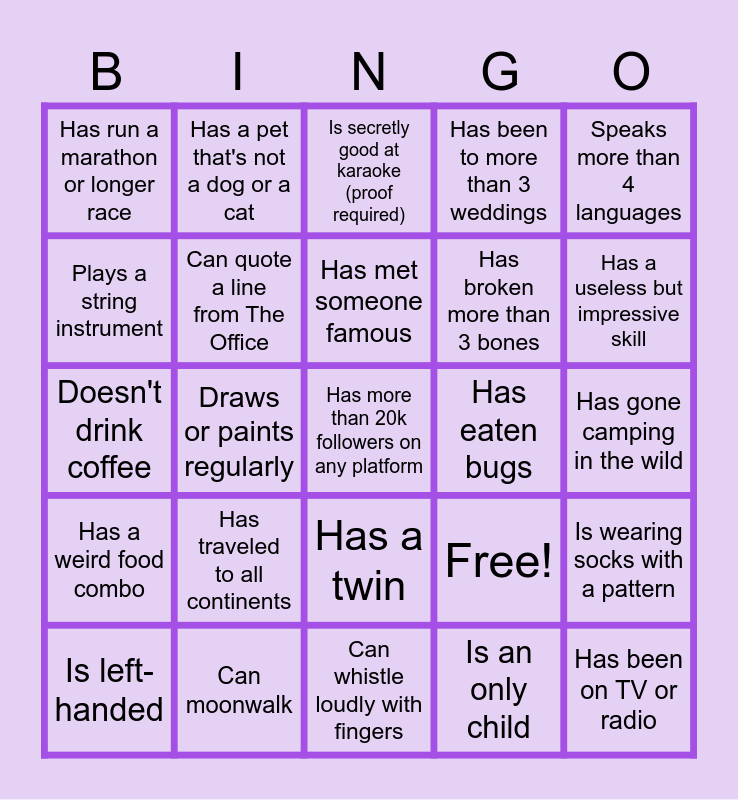 This bingo card has 25 words: Has traveled to all continents, Can whistle loudly with fingers, Has met someone famous, Is left-handed, Speaks more than 4 languages, Has run a marathon or longer race, Plays a string instrument, Has a pet that's not a dog or a cat, Has eaten bugs, Has a twin, Has broken more than 3 bones, Doesn't drink coffee, Free!, Is wearing socks with a pattern, Can quote a line from The Office, Has been on TV or radio, Has gone camping in the wild, Is secretly good at karaoke (proof required), Has a useless but impressive skill, Draws or paints regularly, Has more than 20k followers on any platform, Can moonwalk, Has a weird food combo, Has been to more than 3 weddings and Is an only child.