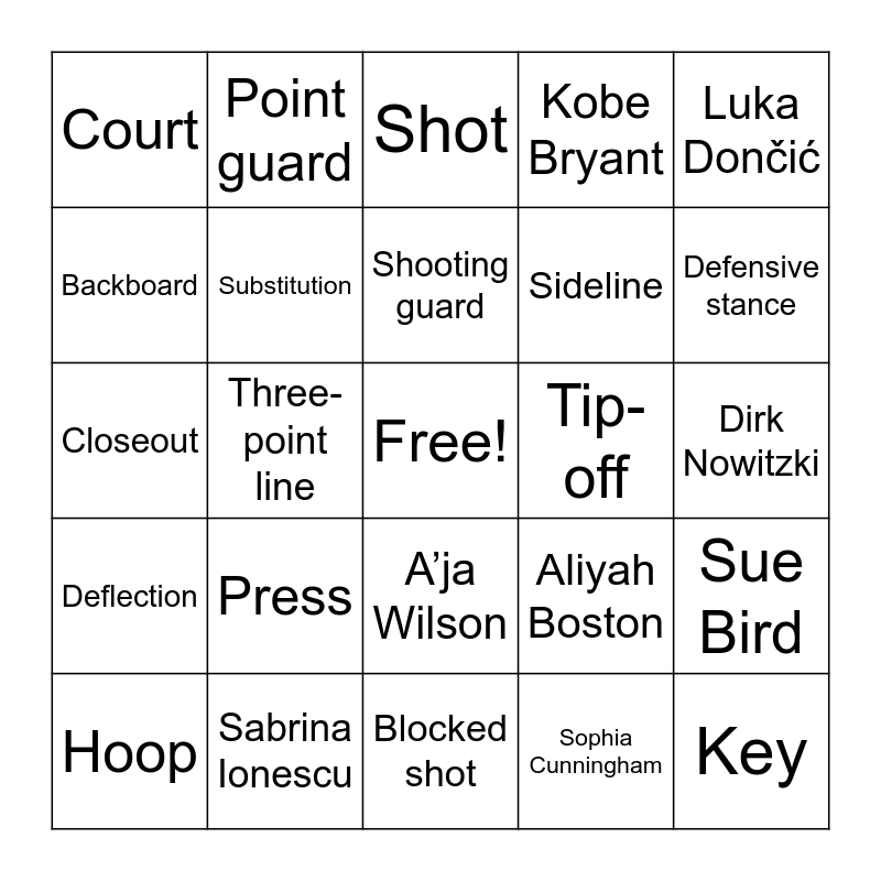 This bingo card has a free space and 85 words: Dribble, Pass, Shot, Dunk, Layup, Free throw, Rebound, Foul, Travel, Double dribble, Jump ball, Timeout, Substitution, Tip-off, Possession, Court, Hoop, Backboard, Rim, Net, Baseline, Sideline, Key, Half-court line, Three-point line, Shot clock, Jump stop, Pivot, Man-to-man, Zone defense, Press, Trap, Double team, Closeout, Switch, Charge, Blocked shot, Steal, Deflection, Defensive stance, Box out, Pick and roll, Post play, Ball movement, Isolation, Drive and kick, Off-ball screen, Perimeter, Wing, Baseline drive, Point guard, Shooting guard, Small forward, Power forward, Center, LeBron James, Sabrina Ionescu, Kobe Bryant, Giannis Antetokounmpo, Diana Taurasi, Shaquille O’Neal, Becky Hammon, Stephen Curry, Candace Parker, Kyrie Irving, Luka Dončić, OG Anunoby, Sue Bird, Kevin Durant, Brittney Griner, Larry Bird, Napheesa Collier, Nikola Jokić, Maya Moore, Ja Morant, A’ja Wilson, Sophia Cunningham, Jayson Tatum, Kelsey Plum, Michael Jordan, Dirk Nowitzki, Caitlin Clark, Breanna Stewart, Aliyah Boston and Magic Johnson.