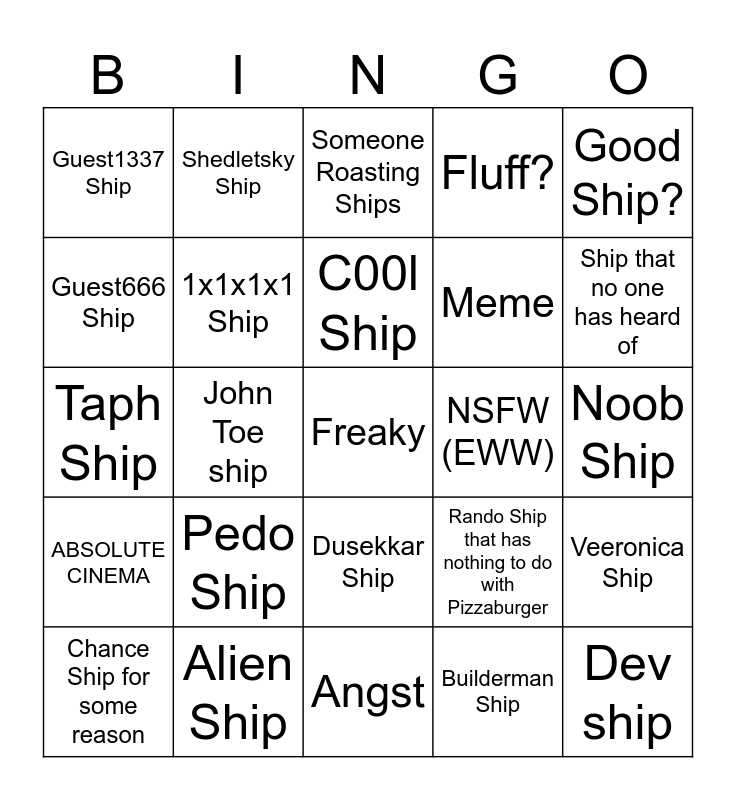 This bingo card has a free space and 24 words: Pedo Ship, Alien Ship, C00l Ship, Chance Ship for some reason, Good Ship?, Guest1337 Ship, Guest666 Ship, Shedletsky Ship, NSFW (EWW), Dusekkar Ship, Meme, Taph Ship, Rando Ship that has nothing to do with Pizzaburger, Veeronica Ship, 1x1x1x1 Ship, Builderman Ship, Noob Ship, Someone Roasting Ships, Ship that no one has heard of, John Toe ship, Dev ship, ABSOLUTE CINEMA, Fluff? and Angst.