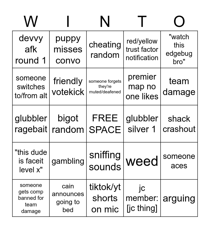 This bingo card has a free space and 39 words: glubbler complains about ping or fps, beer of the day, "ur about to get so unlucky bro", friendly votekick, someone gets comp banned for team damage, sniffing sounds, someone forgets they're muted/deafened, shack abuses util, "watch this edgebug bro", "this dude is faceit level x", bigot random, red/yellow trust factor notification, arguing, shack crashout, glubbler silver 1, gambling, someone doesn’t accept, devvy afk round 1, fang contact, weed, someone switches to/from alt, tiktok/yt shorts on mic, premier map no one likes, team damage, "oh god [region] servers", someone falls asleep in vc, winton exit, brainrot, watch this: *dies*, puppy misses convo, [color] [person/thing], conquest comes in to stream, cheating random, cain announces going to bed, jc member: [jc thing], mr. winton sentience, someone aces, glubbler ragebait and terrible time estimate.