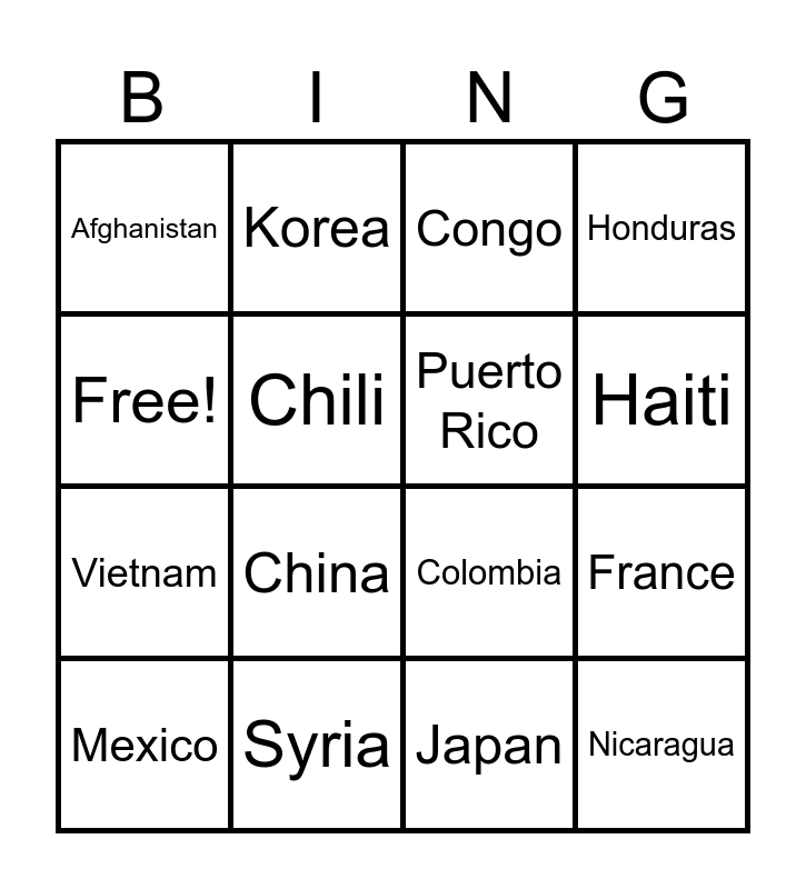 This bingo card has 16 words: Syria, France, Congo, Afghanistan, Vietnam, Korea, Colombia, Japan, Free!, Chili, Mexico, Honduras, China, Haiti, Puerto Rico and Nicaragua.