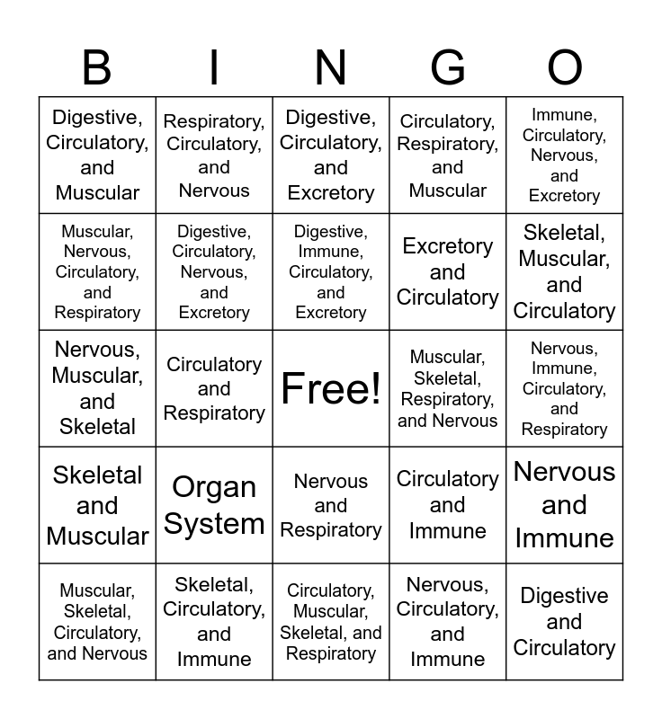 This bingo card has a free space and 24 words: Organ System, Skeletal, Circulatory, and Immune, Digestive, Immune, Circulatory, and Excretory, Muscular, Skeletal, Circulatory, and Nervous, Immune, Circulatory, Nervous, and Excretory, Digestive, Circulatory, and Muscular, Muscular, Nervous, Circulatory, and Respiratory, Respiratory, Circulatory, and Nervous, Muscular, Skeletal, Respiratory, and Nervous, Nervous and Respiratory, Excretory and Circulatory, Nervous, Muscular, and Skeletal, Circulatory and Immune, Nervous and Immune, Digestive, Circulatory, Nervous, and Excretory, Nervous, Circulatory, and Immune, Nervous, Immune, Circulatory, and Respiratory, Digestive, Circulatory, and Excretory, Skeletal, Muscular, and Circulatory, Circulatory and Respiratory, Digestive and Circulatory, Skeletal and Muscular, Circulatory, Respiratory, and Muscular and Circulatory, Muscular, Skeletal, and Respiratory.