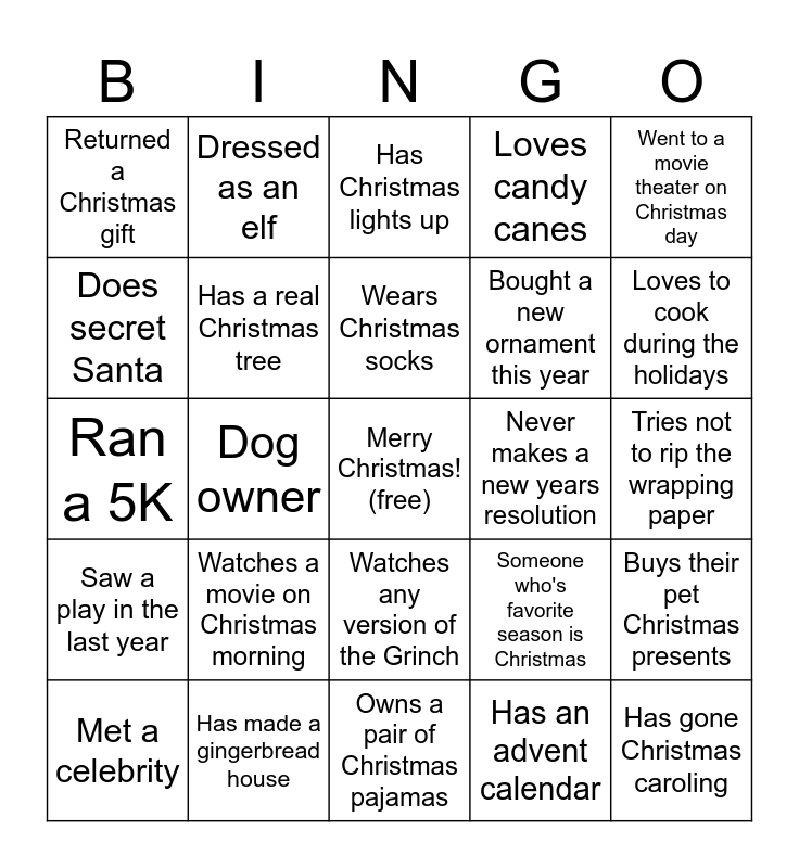 This bingo card has a free space and 24 words: Watches a movie on Christmas morning, Has made a gingerbread house, Wears Christmas socks, Met a celebrity, Went to a movie theater on Christmas day, Returned a Christmas gift, Does secret Santa, Dressed as an elf, Never makes a new years resolution, Watches any version of the Grinch, Bought a new ornament this year, Ran a 5K, Someone who's favorite season is Christmas, Buys their pet Christmas presents, Has a real Christmas tree, Has an advent calendar, Tries not to rip the wrapping paper, Has Christmas lights up, Loves to cook during the holidays, Dog owner, Has gone Christmas caroling, Saw a play in the last year, Loves candy canes and Owns a pair of Christmas pajamas.