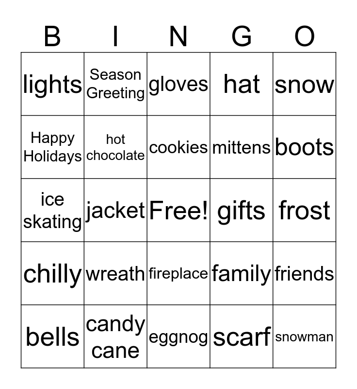 This bingo card has a free space and 24 words: wreath, candy cane, cookies, bells, snow, lights, Happy Holidays, Season Greeting, gifts, fireplace, mittens, ice skating, family, friends, hot chocolate, scarf, frost, gloves, boots, jacket, snowman, chilly, hat and eggnog.