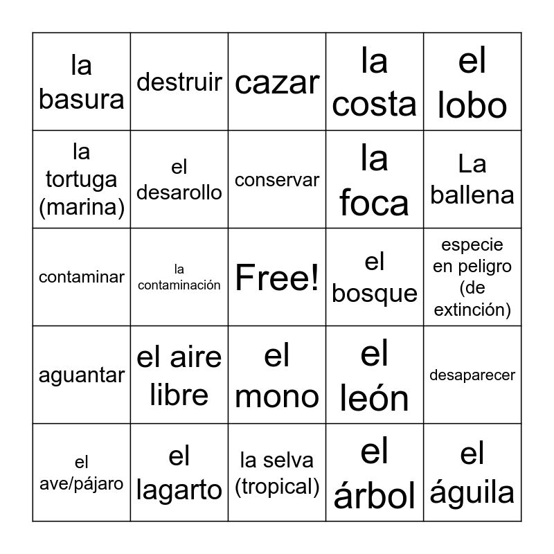 This bingo card has a free space and 24 words: el aire libre, el lagarto, conservar, el ave/pájaro, el lobo, la basura, la tortuga (marina), destruir, el bosque, el mono, la foca, contaminar, el león, desaparecer, el desarollo, el árbol, especie en peligro (de extinción), cazar, La ballena, la contaminación, el águila, aguantar, la costa and la selva (tropical).