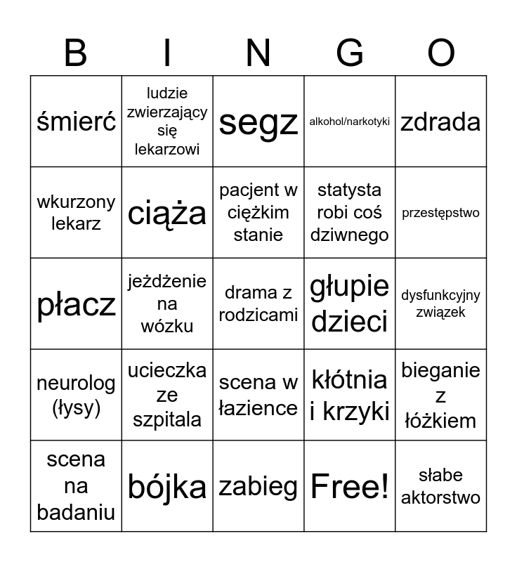 This bingo card has 30 words: bójka, ordynator, jeżdżenie na wózku, ochrona, śmierć, segz, ciąża, scena w łazience, głupie dzieci, zabieg, dysfunkcyjny związek, drama z rodzicami, Free!, słabe aktorstwo, przestępstwo, operacja, kłótnia i krzyki, neurolog (łysy), ucieczka ze szpitala, zdrada, płacz, patologia, ludzie zwierzający się lekarzowi, statysta robi coś dziwnego, wkurzony lekarz, alkohol/narkotyki, bieganie z łóżkiem, scena na badaniu, pacjent w ciężkim stanie and good ending.
