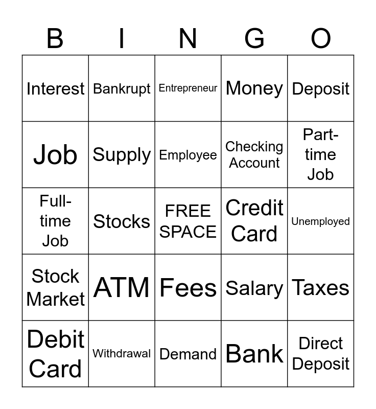 This bingo card has a free space and 29 words: Debit Card, Check, Stocks, Paycheck, Interest, Entrepreneur, Supply, ATM, Credit Card, Withdrawal, Unemployed, Direct Deposit, Demand, Bank, Part-time Job, Savings Account, Fees, Stock Market, Deposit, Full-time Job, Salary, Bills, Checking Account, Job, Money, Bankrupt, Taxes, Employee and Government.