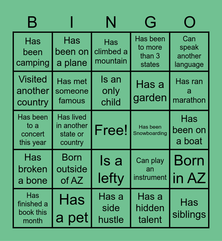This bingo card has a free space and 24 words: Born outside of AZ, Has a pet, Is an only child, Has finished a book this month, Can speak another language, Has been camping, Visited another country, Has been on a plane, Has been Snowboarding, Is a lefty, Has a garden, Has been to a concert this year, Can play an instrument, Born in AZ, Has met someone famous, Has a hidden talent, Has been on a boat, Has climbed a mountain, Has ran a marathon, Has lived in another state or country, Has siblings, Has broken a bone, Has been to more than 3 states and Has a side hustle.