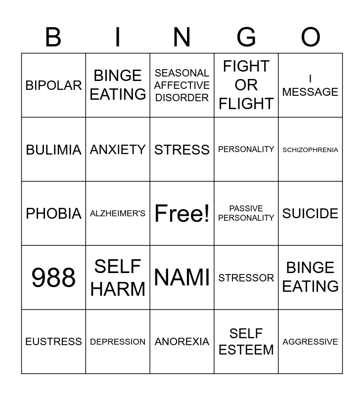 This bingo card has a free space and 24 words: SELF HARM, DEPRESSION, STRESS, EUSTRESS, I MESSAGE, BIPOLAR, BULIMIA, BINGE EATING, PASSIVE PERSONALITY, NAMI, PERSONALITY, PHOBIA, STRESSOR, BINGE EATING, ANXIETY, SELF ESTEEM, SUICIDE, SEASONAL AFFECTIVE DISORDER, SCHIZOPHRENIA, ALZHEIMER'S, AGGRESSIVE, 988, FIGHT OR FLIGHT and ANOREXIA.
