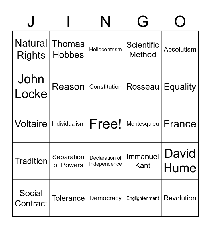 This bingo card has a free space and 24 words: Separation of Powers, Tolerance, Constitution, Social Contract, Absolutism, Natural Rights, John Locke, Thomas Hobbes, Montesquieu, Declaration of Independence, Rosseau, Voltaire, Immanuel Kant, David Hume, Reason, Englightenment, France, Heliocentrism, Equality, Individualism, Revolution, Tradition, Scientific Method and Democracy.