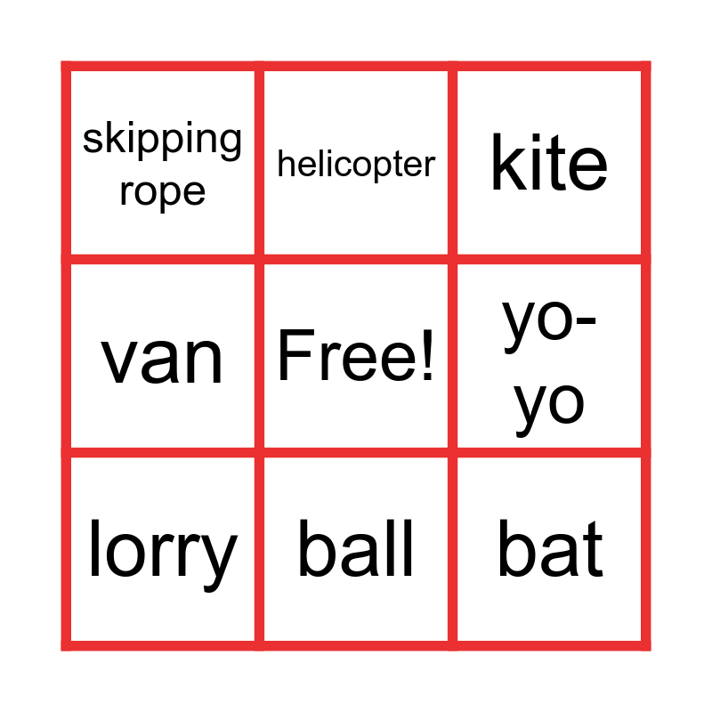 This bingo card has a free space and 15 words: scooter, skateboard, kite, skipping rope, ball, bat, bike, frisbee, yo-yo, boat, motorbike, van, lorry, helicopter and plane.