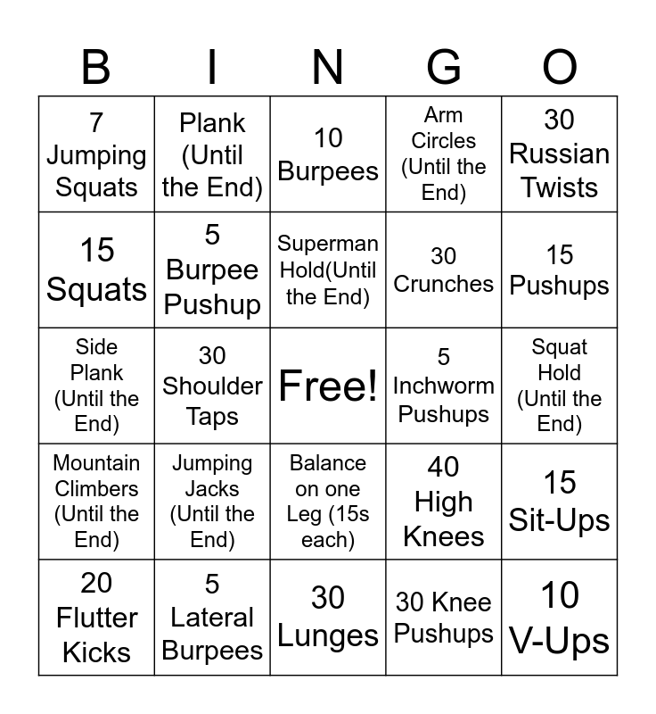 This bingo card has a free space and 24 words: Jumping Jacks (Until the End), 5 Lateral Burpees, Superman Hold(Until the End), 20 Flutter Kicks, 30 Russian Twists, 7 Jumping Squats, 15 Squats, Plank (Until the End), 5 Inchworm Pushups, Balance on one Leg (15s each), 30 Crunches, Side Plank (Until the End), 40 High Knees, 15 Sit-Ups, 5 Burpee Pushup, 30 Knee Pushups, Squat Hold (Until the End), 10 Burpees, 15 Pushups, 30 Shoulder Taps, 10 V-Ups, Mountain Climbers (Until the End), Arm Circles (Until the End) and 30 Lunges.
