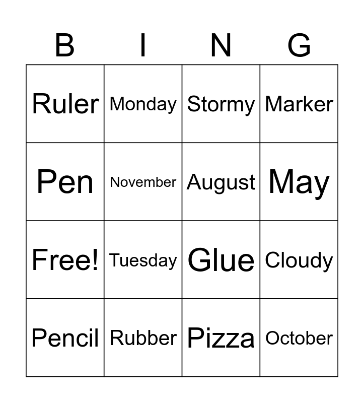 This bingo card has 20 words: Cloudy, Sunny, Stormy, Windy, Pencil, Pen, Rubber, Ruler, Free!, Monday, Tuesday, Glue, November, October, August, September, May, Marker, Pizza and Banana.