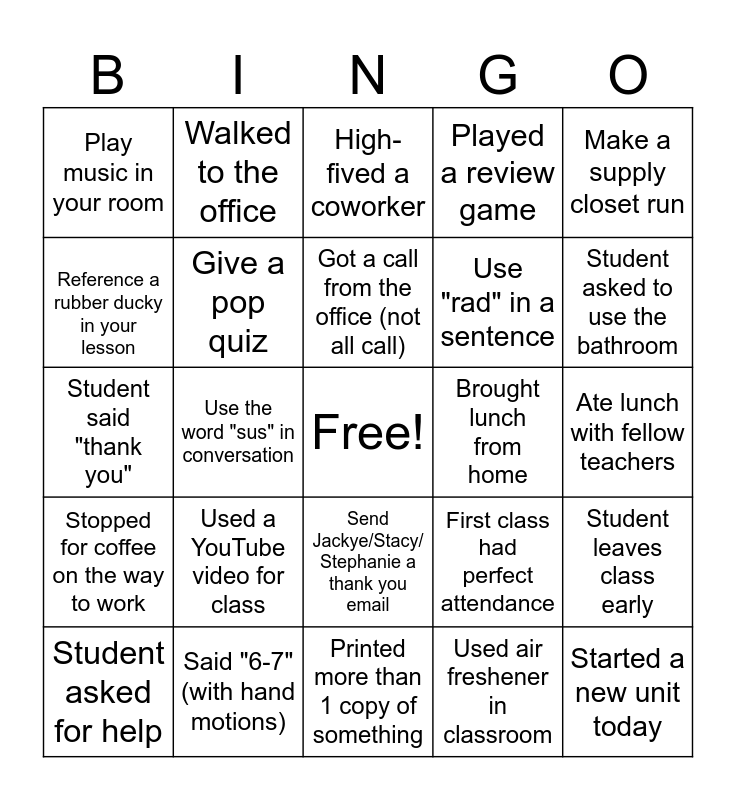 This bingo card has a free space and 34 words: Brought coffee from home, Used air freshener in classroom, Student's birthday this week (sing Happy Birthday), Tell a joke in class, Stopped for coffee on the way to work, Give a pop quiz, Make a supply closet run, Student asked for help, Walked to the office, Started a sentence with "When I was in school...", Got a call from the office (not all call), High-fived a coworker, Take a selfie with a coworker, Experienced tech issues, Brought lunch from home, Student asked to use the bathroom, Said "6-7" (with hand motions), Student said "thank you", Used a YouTube video for class, First class had perfect attendance, Send Jackye/Stacy/ Stephanie a thank you email, Forgot lunch at home, Play music in your room, Ate lunch with fellow teachers, Printed more than 1 copy of something, Started a new unit today, Played a review game, Clean off your desk, Use "rad" in a sentence, Reference a rubber ducky in your lesson, Borrow a rubber ducky from Mr Lewis, Use the word "sus" in conversation, Student leaves class early and Hear a weird sound from the walkie.