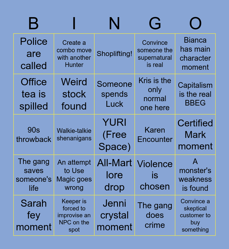 This bingo card has a free space and 24 words: An attempt to Use Magic goes wrong, Keeper is forced to improvise an NPC on the spot, Someone spends Luck, Sarah fey moment, Bianca has main character moment, Police are called, Office tea is spilled, Create a combo move with another Hunter, Karen Encounter, All-Mart lore drop, Kris is the only normal one here, 90s throwback, Violence is chosen, A monster's weakness is found, Weird stock found, The gang does crime, Certified Mark moment, Shoplifting!, Capitalism is the real BBEG, Walkie-talkie shenanigans, Convince a skeptical customer to buy something, The gang saves someone's life, Convince someone the supernatural is real and Jenni crystal moment.
