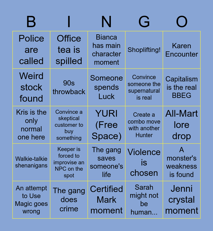This bingo card has a free space and 24 words: An attempt to Use Magic goes wrong, Keeper is forced to improvise an NPC on the spot, Someone spends Luck, Sarah might not be human..., Karen Encounter, Police are called, Office tea is spilled, Bianca has main character moment, Create a combo move with another Hunter, All-Mart lore drop, Kris is the only normal one here, 90s throwback, Violence is chosen, A monster's weakness is found, Weird stock found, The gang does crime, Certified Mark moment, Shoplifting!, Capitalism is the real BBEG, Walkie-talkie shenanigans, Convince a skeptical customer to buy something, The gang saves someone's life, Convince someone the supernatural is real and Jenni crystal moment.