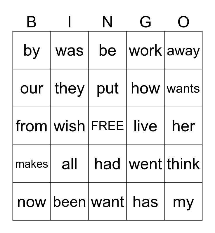 This bingo card has a free space and 42 words: here, put, for, all, has, think, my, both, be, had, her, wants, wish, away, ask, went, made, from, five, was, our, ride, have, by, not, start, how, down, your, me, what, makes, they, want, white, now, been, live, very, laugh, work and could.
