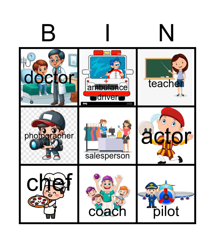 This bingo card has 11 images, a free space and 11 words: vet, coach, pilot, chef, ambulance driver, teacher, actor, scientist, photographer, doctor and nurse.