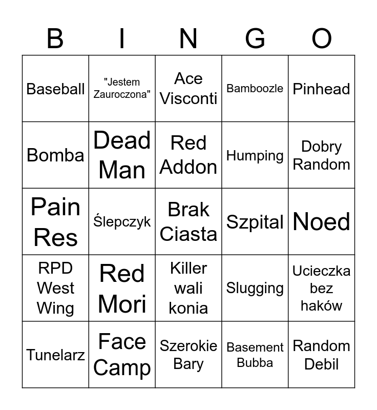 This bingo card has a free space and 24 words: Tunelarz, Red Mori, Red Addon, Basement Bubba, Pinhead, Baseball, "Jestem Zauroczona", Ace Visconti, Szpital, Noed, Pain Res, Dead Man, Slugging, Ucieczka bez haków, Bomba, Face Camp, Szerokie Bary, Bamboozle, Dobry Random, RPD West Wing, Ślepczyk, Killer wali konia, Humping and Random Debil.