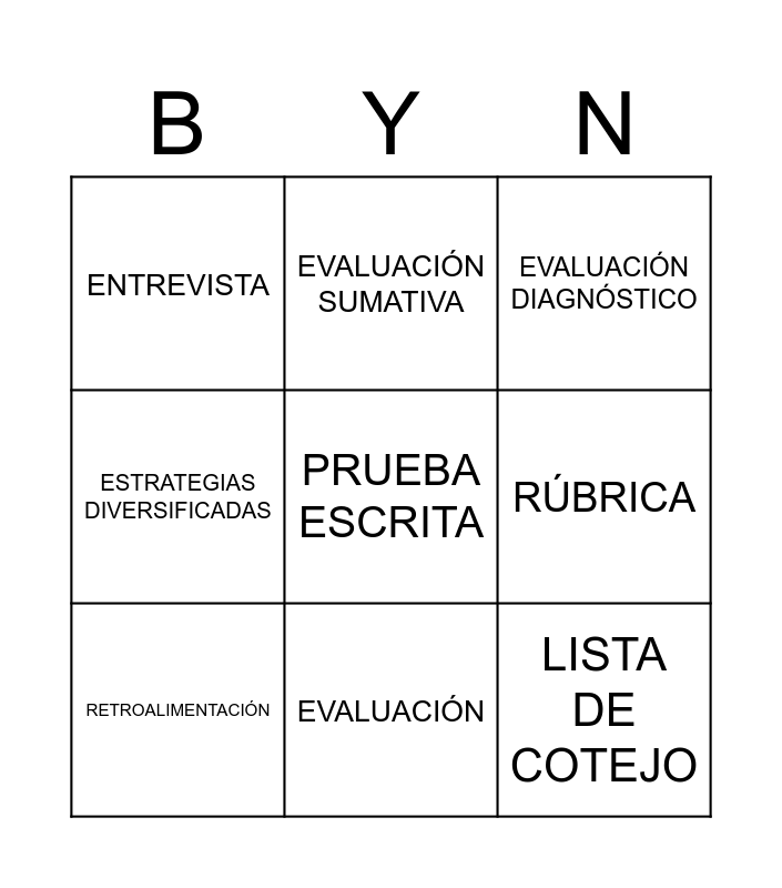This bingo card has 12 words: Observación, EVALUACIÓN, LISTA DE COTEJO, ESTRATEGIAS DIVERSIFICADAS, EVALUACIÓN SUMATIVA, RÚBRICA, RETROALIMENTACIÓN, EVALUACIÓN FORMATIVA, EVALUACIÓN DIAGNÓSTICO, ENTREVISTA, PRUEBA ESCRITA and PRUEBA ORAL.