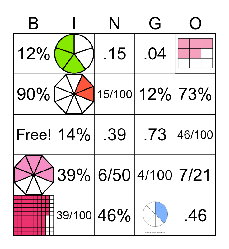 This bingo card has 10 images, a free space and 24 words: 15/100, .15, 15%, 73/100, .73, 73%, 39/100, Free!, 39%, 4/100, 6/50, .12, 12%, 46/100, 46%, .46, .04, 4%, 12%, 90%, 95%, 14%, 7/21 and 19/38.