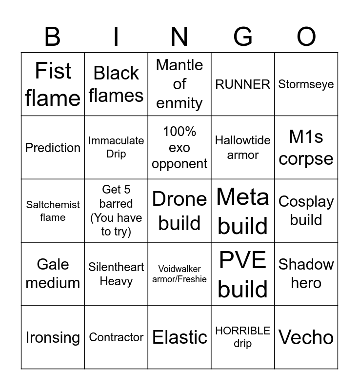 This bingo card has a free space and 24 words: Silentheart Heavy, Contractor, 100% exo opponent, Ironsing, Stormseye, Fist flame, Prediction, Black flames, Meta build, Voidwalker armor/Freshie, Hallowtide armor, Saltchemist flame, PVE build, Shadow hero, Immaculate Drip, HORRIBLE drip, Cosplay build, Mantle of enmity, M1s corpse, Get 5 barred (You have to try), Vecho, Gale medium, RUNNER and Elastic.