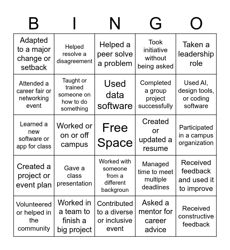This bingo card has a free space and 24 words: Gave a class presentation, Worked in a team to finish a big project, Used data software, Volunteered or helped in the community, Taken a leadership role, Adapted to a major change or setback, Attended a career fair or networking event, Helped resolve a disagreement, Created or updated a resume, Worked with someone from a different backgroun, Completed a group project successfully, Learned a new software or app for class, Managed time to meet multiple deadlines, Received feedback and used it to improve, Taught or trained someone on how to do something, Asked a mentor for career advice, Participated in a campus organization, Helped a peer solve a problem, Used AI, design tools, or coding software, Worked or on or off campus, Received constructive feedback, Created a project or event plan, Took initiative without being asked and Contributed to a diverse or inclusive event.