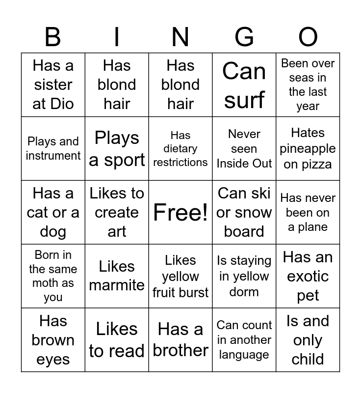 This bingo card has a free space and 24 words: Has brown eyes, Likes marmite, Has dietary restrictions, Can count in another language, Been over seas in the last year, Has a sister at Dio, Has blond hair, Has blond hair, Can ski or snow board, Has never been on a plane, Has a cat or a dog, Plays a sport, Is staying in yellow dorm, Has an exotic pet, Plays and instrument, Likes to read, Has a brother, Can surf, Hates pineapple on pizza, Born in the same moth as you, Likes to create art, Likes yellow fruit burst, Never seen Inside Out and Is and only child.