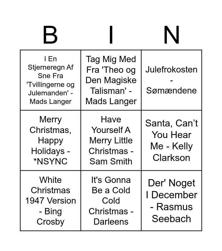 This bingo card has 100 words: 8 Days of Christmas - Destiny's Child, A Holly Jolly Christmas - Burl Ives, All I Want for Christmas Is You - Mariah Carey, Blue Christmas - Elvis Presley, Can't Stop Christmas - Robbie Williams, Christmas (Baby Please Come Home) - Darlene Love, Christmas In Hollis - Run–D.M.C., Christmas Lights - Coldplay, Christmas Rappin' - Kurtis Blow, Christmas Time - Backstreet Boys, Christmas Time - Bryan Adams, Cool Jul - Pyrus, Cozy Little Christmas - Katy Perry, Cuddle Up, Cozy Down Christmas - Dolly Parton, December December - Rasmus Walter, Den Himmelblå - Shu-Bi-Dua, Der' Noget I December - Rasmus Seebach, Det'cember Rap Version - Sys Bjerre, Do They Know It's Christmas? 1984 Version - Band Aid, Driving Home for Christmas - Chris Rea, Endelig Jul Igen - Gasolin', Englebarn (Hollys Jul) feat. Holly - Uffe Holm, Finally It's Christmas Again - Youknowwho, Gnags' Julesang - Gnags, Guld Jul - Gulddreng, Happy Xmas (War Is Over) Remastered 2010 - John Lennon, Have Yourself A Merry Little Christmas - Sam Smith, HERE (For Christmas) - Lukas Graham, Here Comes Santa Claus (Right Down Santa Claus Lane) - Elvis Presley, Hey Mor - Joey Moe, Holly Jolly Christmas - Michael Bublé, I En Stjerneregn Af Sne Fra 'Tvillingerne og Julemanden' - Mads Langer, I Wish It Could Be Christmas Everyday - Wizzard, I'll Be Home - Meghan Trainor, It's Beginning to Look a Lot like Christmas - Michael Bublé, It's Gonna Be a Cold Cold Christmas - Darleens, It's Hard to Be a Nissemand - De Nattergale, It's the Most Wonderful Time of the Year - Andy Williams, Jeg Så Julemanden Kysse Mor - Burhan G, Jingle Bell Rock - Bobby Helms, Jingle Bells (feat. The Puppini Sisters) Michael Bublé, Jul Det' Cool - Mc Einar, Jul i Angora - Drengene Fra Angora, Jul På Vesterbro - Anders Matthesen, Julebal I Nisseland - Diskofil, Julefrokosten - Sømændene, Julen varer længe - Peter Belli, Just Like Christmas - Low, Kiss Me It's Christmas (feat. Ne-Yo) - Leona Lewis, Koldt Udenfor - Page Four, Kongespil Tinka og Kongespillet - Hjalmer, Last Christmas - Wham!, Let It Snow! Let It Snow! Let It Snow! - Dean Martin, Let Love Be Love - Juice, Like It's Christmas - Jonas Brothers, Mary's Boy Child - Boney M., Merry Christmas - Ed Sheeran, Merry Christmas Baby - Bruce Springsteen, Merry Christmas Everyone - Shakin' Stevens, Merry Christmas, Happy Holidays - *NSYNC, Merry Xmas Everybody - Slade, Mistletoe and Wine - Cliff Richard, Mistletoe Justin Bieber, My Only Wish (This Year) - Britney Spears, Når Sneen Falder - Thomas Helmig, Oh Santa! (feat. Ariana Grande & Jennifer Hudson) - Mariah Carey, One More Sleep - Leona Lewis, Op til jul Fed Version - Bossen Og Bumsen, Peace On Earth / Little Drummer Boy Medley - Bing Crosby, Please Come Home for Christmas - 2013 Remaster - Eagles, Rap Jul - Shu-Bi-Dua, Rockin' Around The Christmas Tree - Mel & Kim, Run Rudolph Run - Chuck Berry, Santa Baby - Kylie Minogue, Santa Claus Go Straight To The Ghetto - James Brown, Santa Claus Is Coming To Town - The Jackson 5, Santa Tell Me - Ariana Grande, Santa, Can’t You Hear Me - Kelly Clarkson, Shake Up Christmas - Train, Sleigh Ride - The Ronettes, Snowman - Sia, Someday At Christmas - Justin Bieber, Stay Another Day - East 17, Step Into Christmas Remastered 1995 - Elton John, Søren Banjomus - Otto Brandenburg, Tag Mig Med Fra 'Theo og Den Magiske Talisman' - Mads Langer, Thank God It's Christmas - Queen, The Chipmunk Song (Christmas Don't Be Late) Remastered 1999 - Alvin & The Chipmunks, The Støvle Dance - De Nattergale, This Christmas - Alexander Oscar, Underneath the Tree - Kelly Clarkson, Valdes Jul - Christopher, Vi lover hinanden - Sanne Salomonsen, What Christmas Means To Me - Stevie Wonder, White Christmas 1947 Version - Bing Crosby, Winter Wonderland - Tony Bennett, Wonderful Christmastime Edited Version / Remastered 2011 - Paul McCartney, Wrap Me Up - Jimmy Fallon, X-Mas (Let's Do It Again) - Alphabeat and You Make It Feel Like Christmas (feat. Blake Shelton) - Gwen Stefani.