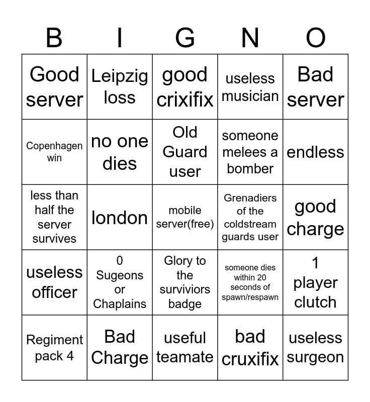 This bingo card has a free space and 24 words: 0 Sugeons or Chaplains, Bad Charge, Old Guard user, Regiment pack 4, Bad server, Good server, Copenhagen win, Leipzig loss, Grenadiers of the coldstream guards user, Glory to the surviviors badge, someone melees a bomber, less than half the server survives, someone dies within 20 seconds of spawn/respawn, 1 player clutch, no one dies, bad cruxifix, good charge, good crixifix, endless, london, useless surgeon, useless officer, useless musician and useful teamate.