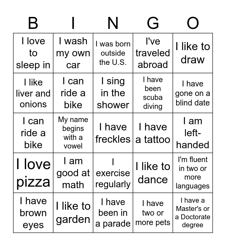 This bingo card has a free space and 34 words: I shop online, I have two or more pets, I check Facebook daily, I have a younger sister, I love pizza, I can ride a bike, I like to draw, I have brown eyes, I wash my own car, I like cats better than dogs, I sing in the shower, I was born outside the U.S., I prefer tea over coffee, I have a dog, I have a tattoo, I have gone on a blind date, I like to garden, I can ride a bike, I am good at math, I like to dance, I exercise regularly, I never swear, I love to sleep in, I am left-handed, I have been in a parade, I have a Master's or a Doctorate degree, I've traveled abroad, I love to watch sports, I have been scuba diving, I like liver and onions, I hate ice cream, My name begins with a vowel, I'm fluent in two or more languages and I love to read books.