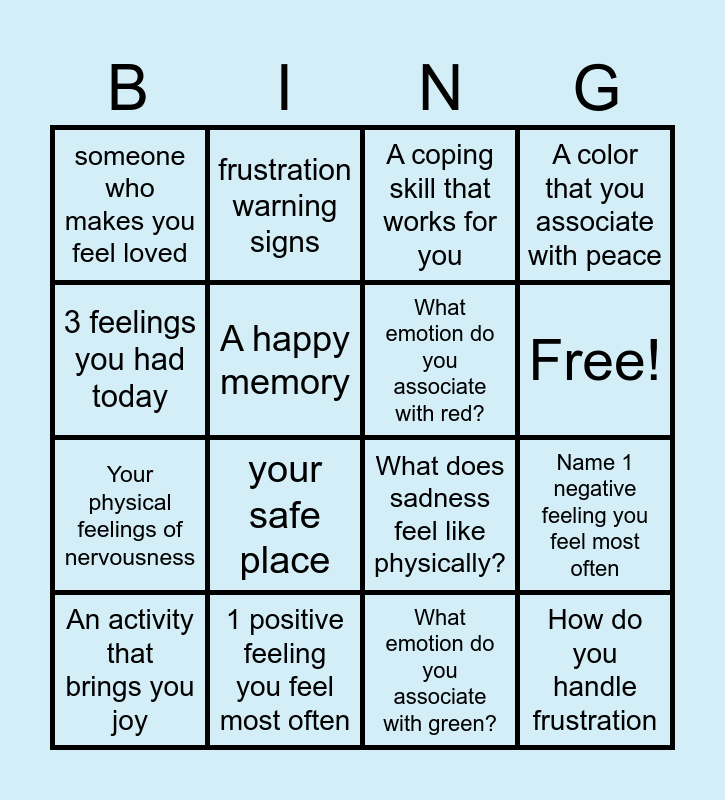 This bingo card has 18 words: your safe place, How do you handle frustration, A coping skill that works for you, someone who makes you feel loved, What does sadness feel like physically?, A color that you associate with peace, An activity that brings you joy, frustration warning signs, Free!, Your physical feelings of nervousness, What emotion do you associate with green?, 3 feelings you had today, Name 1 negative feeling you feel most often, A happy memory, What emotion do you associate with red?, What song makes you feel good?, 1 positive feeling you feel most often and How do you feel when you are with family?.