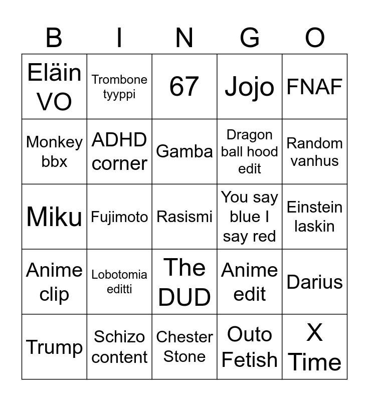 This bingo card has a free space and 24 words: Lobotomia editti, Schizo content, Gamba, Trump, FNAF, Eläin VO, Monkey bbx, Trombone tyyppi, You say blue I say red, The DUD, Dragon ball hood edit, Miku, Anime edit, Darius, ADHD corner, Outo Fetish, Einstein laskin, 67, Random vanhus, Fujimoto, X Time, Anime clip, Jojo and Chester Stone.