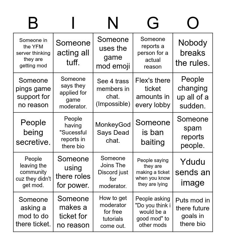 This bingo card has a free space and 29 words: Someone asking a mod to do there ticket., People glazing you for no reason., People having "Sucessful reports in there bio, Minimods appear out of no where, Someone in the YFM server thinking they are getting mod, Someone uses the game mod emoji, Someone says they applied for game moderator., Someone using there roles for power., Someone is ban baiting, Someone makes a ticket for no reason, Someone spam reports people., Puts mod in there future goals in there bio, How to get moderator for free tutorials come out., People asking "Do you think i would be a good mod" to other mods, People changing up all of a sudden., People crying cuz they didn't get mod, Someone Joins The Discord just for moderator., People leaving the community cuz they didn't get mod., Nobody breaks the rules., People being secretive., People saying they are making a ticket when you know they are lying, People making mod predictions, Flex's there ticket amounts in every lobby, Someone pings game support for no reason, Someone reports a person for a actual reason, Someone acting all tuff., Ydudu sends an image, See 4 trass members in chat. (Impossible) and A game mod moderating.