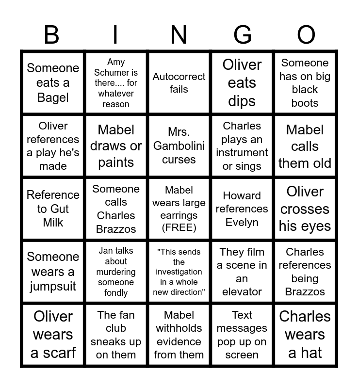 This bingo card has a free space and 24 words: Oliver wears a scarf, Jan talks about murdering someone fondly, Mrs. Gambolini curses, Text messages pop up on screen, Someone has on big black boots, Someone eats a Bagel, Amy Schumer is there.... for whatever reason, Autocorrect fails, Howard references Evelyn, Oliver crosses his eyes, Reference to Gut Milk, Mabel draws or paints, They film a scene in an elevator, Charles references being Brazzos, Oliver references a play he's made, The fan club sneaks up on them, Mabel withholds evidence from them, Oliver eats dips, Mabel calls them old, Someone wears a jumpsuit, Someone calls Charles Brazzos, "This sends the investigation in a whole new direction", Charles plays an instrument or sings and Charles wears a hat.