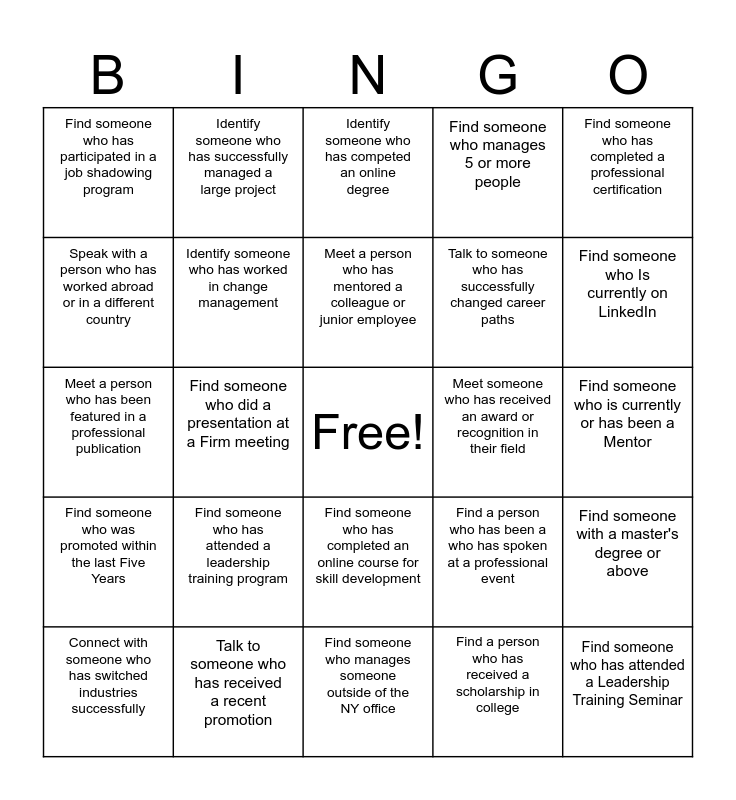 This bingo card has a free space and 24 words: Find someone who has attended a leadership training program, Talk to someone who has received a recent promotion, Meet a person who has mentored a colleague or junior employee, Connect with someone who has switched industries successfully, Find someone who has completed a professional certification, Find someone who has participated in a job shadowing program, Speak with a person who has worked abroad or in a different country, Identify someone who has successfully managed a large project, Meet someone who has received an award or recognition in their field, Find someone who has completed an online course for skill development, Talk to someone who has successfully changed career paths, Meet a person who has been featured in a professional publication, Find a person who has been a who has spoken at a professional event, Find someone with a master's degree or above, Identify someone who has worked in change management, Find a person who has received a scholarship in college, Find someone who is currently or has been a Mentor, Identify someone who has competed an online degree, Find someone who Is currently on LinkedIn, Find someone who did a presentation at a Firm meeting, Find someone who has attended a Leadership Training Seminar, Find someone who was promoted within the last Five Years, Find someone who manages 5 or more people and Find someone who manages someone outside of the NY office.