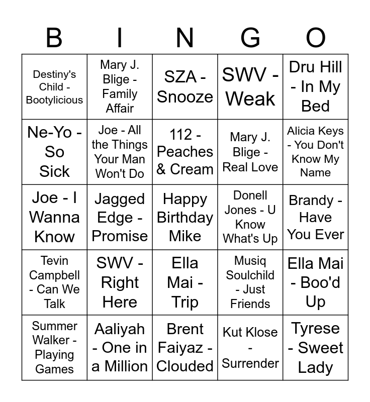 This bingo card has a free space and 60 words: Usher - Nice & Slow, Aaliyah - One in a Million, Monica - So Gone, Tevin Campbell - Can We Talk, Kut Klose - Surrender, Ginuwine - Differences, Joe - All the Things Your Man Won't Do, Jagged Edge - Let's Get Married, Mary J. Blige - Real Love, TLC - Creep, SWV - Weak, Brandy - I Wanna Be Down, Ne-Yo - So Sick, Musiq Soulchild - Love, Beyoncé - Say My Name, Destiny's Child - Bootylicious, Tyrese - Sweet Lady, Dru Hill - In My Bed, Avant - Read Your Mind, 112 - Peaches & Cream, Donell Jones - U Know What's Up, SZA - Snooze, Summer Walker - Playing Games, Ella Mai - Boo'd Up, Kehlani - Nights Like This, Brent Faiyaz - Poison, H.E.R. - Focus, Daniel Caesar - Get You, Alicia Keys - You Don't Know My Name, Erykah Badu - On & On, Brian McKnight - Back at One, Faith Evans - Love Like This, Toni Braxton - He Wasn't Man Enough, D'Angelo - Brown Sugar, Mary J. Blige - Family Affair, Monica - Angel of Mine, Usher - U Got It Bad, Jagged Edge - Promise, Ginuwine - Pony, Joe - I Wanna Know, TLC - No Scrubs, SWV - Right Here, Brandy - Have You Ever, Ne-Yo - Miss Independent, Musiq Soulchild - Just Friends, Beyoncé - Crazy In Love, Summer Walker - Come Thru, SZA - Good Days, Kehlani - Honey, Ella Mai - Trip, Brent Faiyaz - Clouded, H.E.R. - Damage, Daniel Caesar - Best Part, Alicia Keys - If I Ain't Got You, Erykah Badu - Bag Lady, Tyrese - How You Gonna Act Like That, Dru Hill - How Deep Is Your Love, Avant - My Thoughts, 112 - Only You and Donell Jones - Where I Wanna Be.