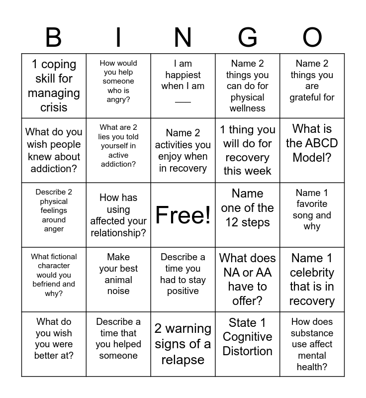 This bingo card has a free space and 34 words: 1 Coping Skill to Manage Anger, State 1 Cognitive Distortion, Describe 1 fear you have about recovery, Give yourself a compliment, What fictional character would you befriend and why?, What are 2 lies you told yourself in active addiction?, Name 2 things you are grateful for, What do you wish you were better at?, How would you help someone who is angry?, Give 1 Example of Self Care, Name 2 activities you enjoy when in recovery, I am happiest when I am ___, Name 3 physical effects of substance use, Share & Practice 1 Mindfulness Activity, Name one of the 12 steps, What is the ABCD Model?, Describe a time that you helped someone, Describe 2 physical feelings around anger, Make your best animal noise, What does NA or AA have to offer?, Describe a time you had to stay positive, Identify 1 of your anger triggers, 1 coping skill for managing crisis, Name 1 favorite song and why, 2 warning signs of a relapse, How does substance use affect mental health?, Name 2 things you can do for physical wellness, Name 2 relapse prevention skills, 1 thing you will do for recovery this week, What do you wish people knew about addiction?, Name one person you can call for help, How has using affected your relationship?, Name 1 celebrity that is in recovery and Name 1 thing people assume about addiction.