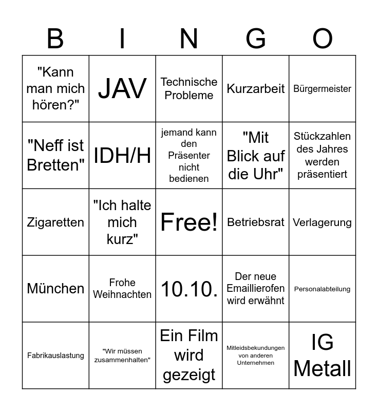 This bingo card has a free space and 29 words: Fabrikauslastung, Werksschließung, "Ich halte mich kurz", Vertrauenskörper-Logo wird gezeigt, "Kann man mich hören?", Technische Probleme, IDH/H, Frohe Weihnachten, Betriebsrat, "Wir müssen zusammenhalten", Verlagerung, IG Metall, Ein Film wird gezeigt, Mitleidsbekundungen von anderen Unternehmen, Stückzahlen des Jahres werden präsentiert, Jemand stellt eine Frage, 10.10., München, Bürgermeister, Zigaretten, Der neue Emaillierofen wird erwähnt, Streik, "Mit Blick auf die Uhr", "Neff ist Bretten", Kurzarbeit, JAV, Personalabteilung, jemand kann den Präsenter nicht bedienen and Gewerkschaft.
