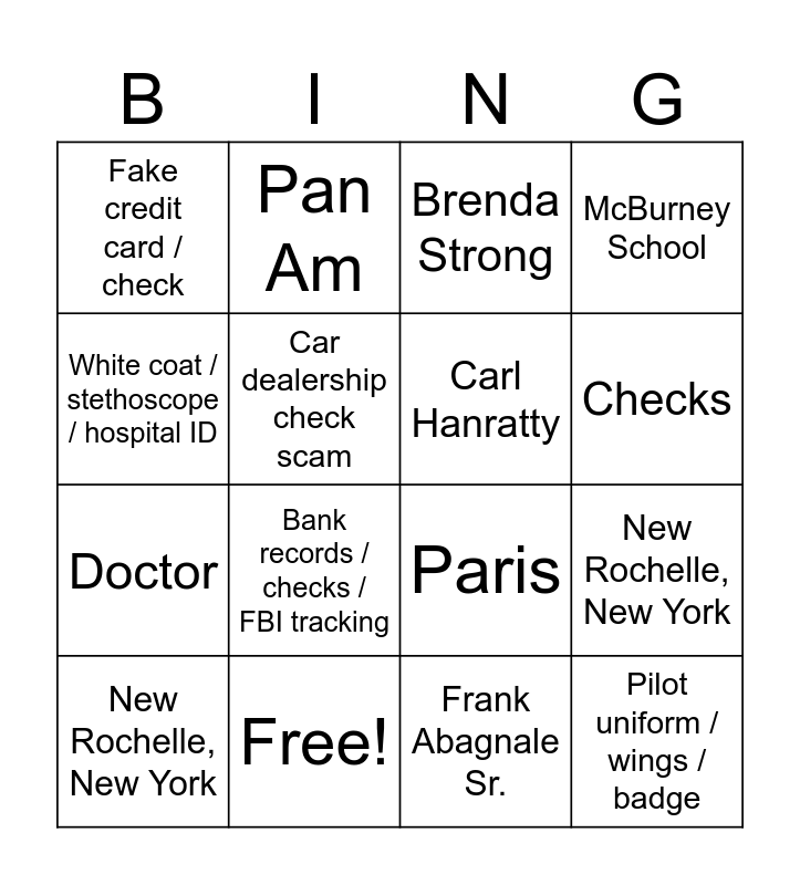 This bingo card has 21 words: Free!, Here’s a clean list of answers for the easier Catch Me If You Can BINGO questions:, Pan Am, New York, Frank Abagnale Sr., Carl Hanratty, Fake credit card / check, Brenda Strong, Paris, Checks, Doctor, McBurney School, Pilot uniform / wings / badge, France (airport), Car dealership check scam, Christmas, New Rochelle, New York, Bank records / checks / FBI tracking, White coat / stethoscope / hospital ID, New Rochelle, New York and Check.