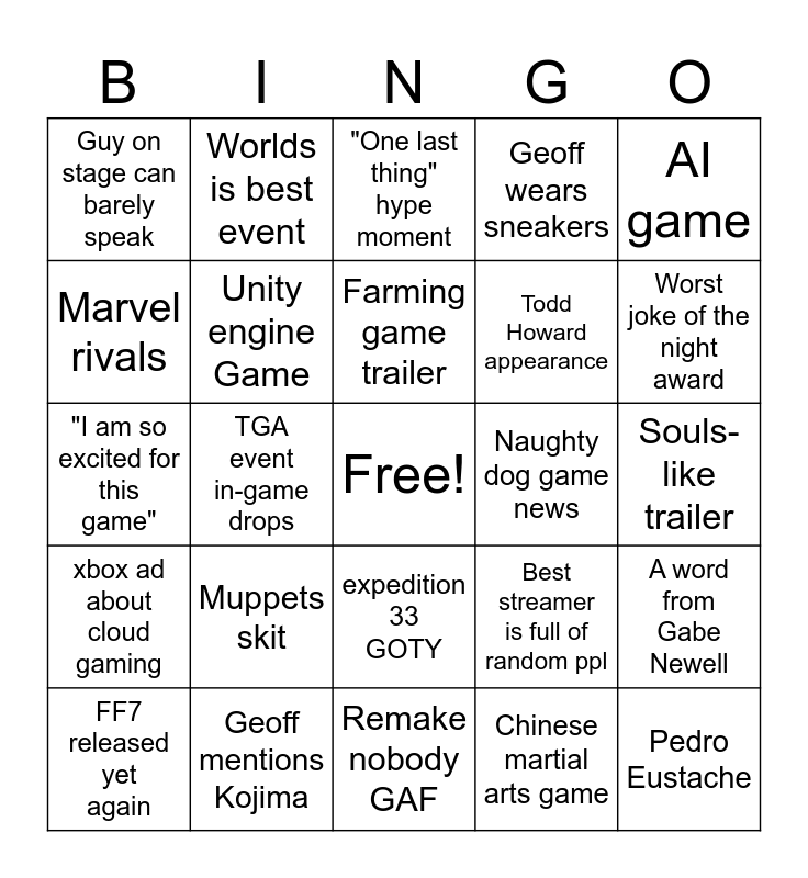 This bingo card has a free space and 24 words: Muppets skit, Geoff mentions Kojima, Farming game trailer, FF7 released yet again, AI game, Guy on stage can barely speak, Marvel rivals, Worlds is best event, Naughty dog game news, expedition 33 GOTY, Todd Howard appearance, "I am so excited for this game", Best streamer is full of random ppl, A word from Gabe Newell, Unity engine Game, Chinese martial arts game, Souls-like trailer, "One last thing" hype moment, Worst joke of the night award, TGA event in-game drops, Pedro Eustache, xbox ad about cloud gaming, Geoff wears sneakers and Remake nobody GAF.