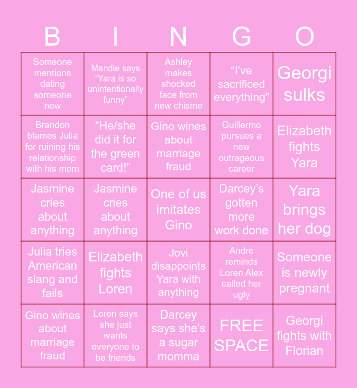 This bingo card has a free space and 65 words: Gino confronts Matt, Elizabeth fights Loren, Jovi disappoints Yara with anything, Guillermo accuses Kara of cheating for the umpteenth time, Yara brings her dog, Julia tries American slang and fails, Mandie says “Yara is so unintentionally funny”, Ashley makes shocked face from new chisme, Darcey’s gotten more work done, Georgi fights with Florian, Brandon blames Julia for ruining his relationship with his mom, Yara makes a quip about another couple (bonus sip if Ashley & Mandie both laugh), FREE SPACE, Elizabeth fights Yara, Andre reminds Loren Alex called her ugly, “He/she did it for the green card!”, Gino wines about marriage fraud, “I’ve sacrificed everything”, Elizabeth argues with Andre, Someone mentions dating someone new, Jasmine cries about anything, Darcey says she’s a sugar momma, Guillermo pursues a new outrageous career, Free!, Georgi sulks, Someone mediates a physical fight, Someone walks off set, Tiger lily/Adnan is there or mentioned, Someone is newly pregnant, FaceTime connection fails, Loren says she just wants everyone to be friends, Mandie hears and update and yells “I knew it!”, Elizabeth calls someone fake, Gino confronts Matt, Elizabeth fights Loren, Jovi disappoints Yara with anything, Guillermo accuses Kara of cheating for the umpteenth time, Yara brings her dog, Julia tries American slang and fails, Mandie says “Yara is so unintentionally funny”, Ashley makes shocked face from new chisme, Darcey’s gotten more work done, Georgi fights with Florian, Brandon blames Julia for ruining his relationship with his mom, Yara makes a quip about another couple (bonus sip if Ashley & Mandie both laugh), Elizabeth fights Yara, Andre reminds Loren Alex called her ugly, “He/she did it for the green card!”, Gino wines about marriage fraud, “I’ve sacrificed everything”, Elizabeth argues with Andre, One of us imitates Gino, Someone mentions dating someone new, Jasmine cries about anything, Darcey says she’s a sugar momma, Guillermo pursues a new outrageous career, Loren says she just wants everyone to be friends, Georgi sulks, Someone mediates a physical fight, Someone walks off set, Tiger lily/Adnan is there or mentioned, Someone is newly pregnant, FaceTime connection fails, Elizabeth calls someone fake and Mandie hears and update and yells “I knew it!”.