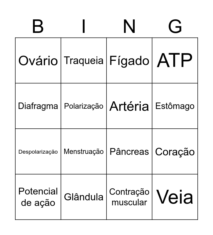 This bingo card has 32 words: Free!, Fisiologia, Coração, Hemoglobina, Veia, Artéria, Diafragma, Pulmão, Traqueia, Alvéolos, Estômago, Fígado, Boca, Intestino Delgado, Glândula, Insulina, Adrenalina, Pâncreas, Neurônio, Sinapse, Axônio, Cérebro, Contração muscular, Actina e miosina, Potencial de ação, ATP, Despolarização, Polarização, Ovário, Testículo, Útero and Menstruação.