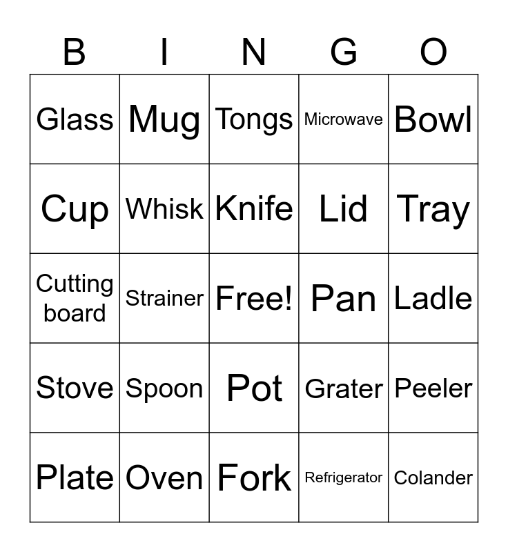 This bingo card has a free space and 25 words: Spoon, Fork, Knife, Plate, Bowl, Glass, Cup, Mug, Pan, Pot, Lid, Cutting board, Grater, Peeler, Whisk, Spatula, Ladle, Tongs, Tray, Strainer, Colander, Oven, Stove, Microwave and Refrigerator.