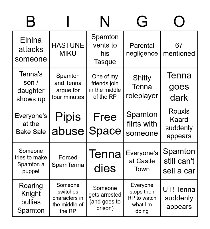 This bingo card has a free space and 24 words: Forced SpamTenna, Someone switches characters in the middle of the RP, One of my friends join in the middle of the RP, Roaring Knight bullies Spamton, 67 mentioned, Elnina attacks someone, Tenna's son / daughter shows up, HASTUNE MIKU, Spamton flirts with someone, Tenna dies, Shitty Tenna roleplayer, Everyone's at the Bake Sale, Everyone's at Castle Town, Spamton still can't sell a car, Spamton and Tenna argue for four minutes, Everyone stops their RP to watch what I'm doing, Rouxls Kaard suddenly appears, Spamton vents to his Tasque, Tenna goes dark, Pipis abuse, UT! Tenna suddenly appears, Someone tries to make Spamton a puppet, Parental negligence and Someone gets arrested (and goes to prison).